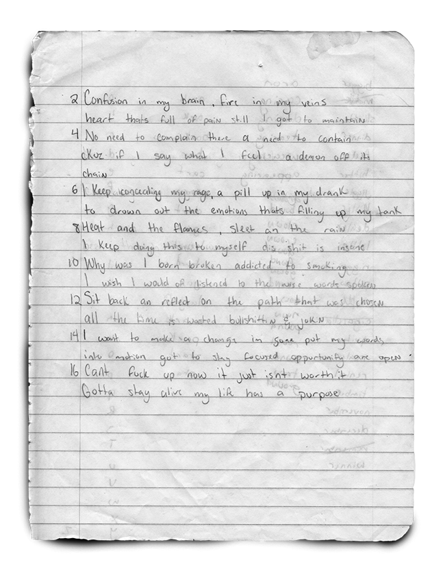 Eric Fluellen was dyslexic, placed in special education and held back several grades. In class he often wrote raps, poems and stories. When he died he left notebooks full of journal writings and loose papers that give insights into his thoughts growing up.
